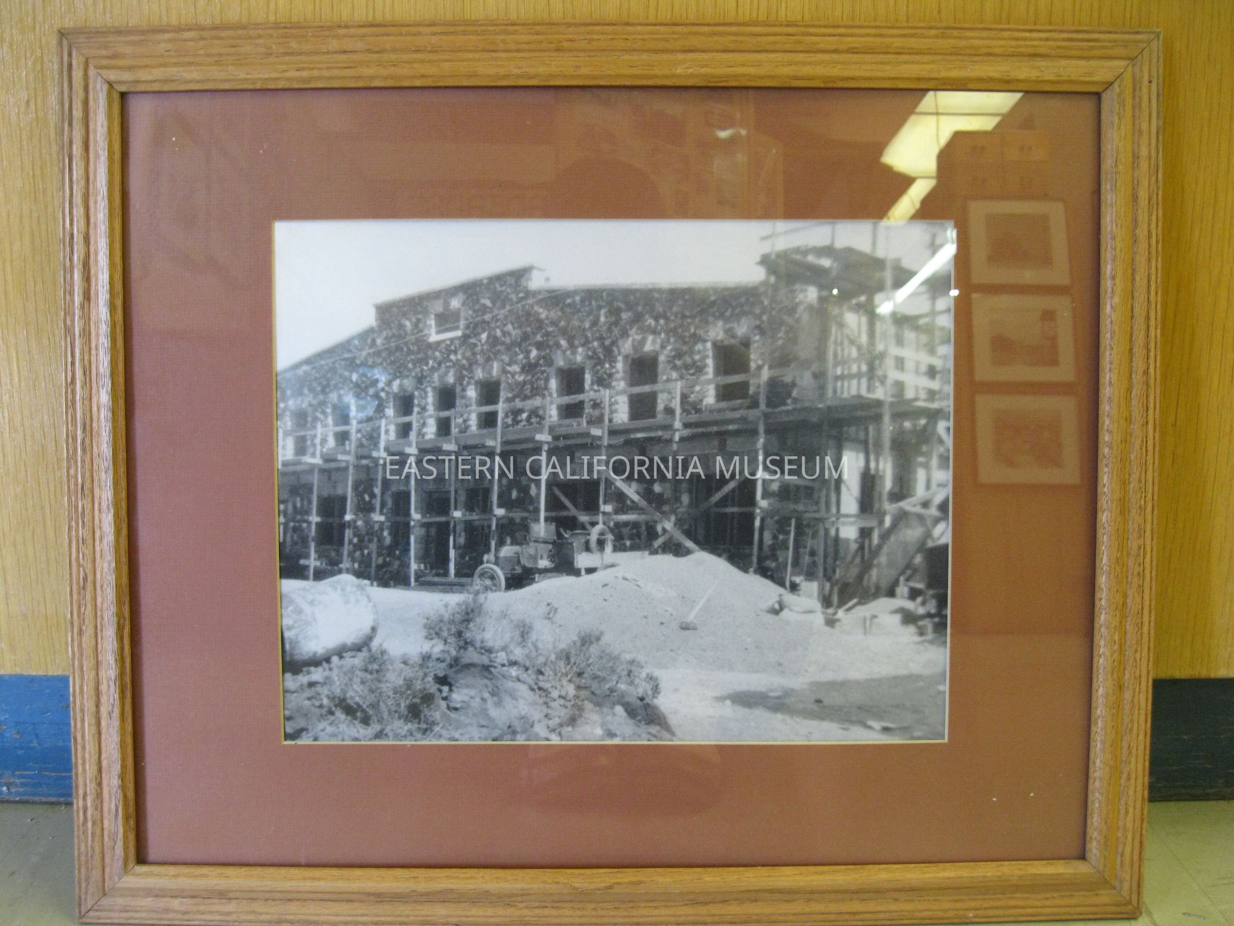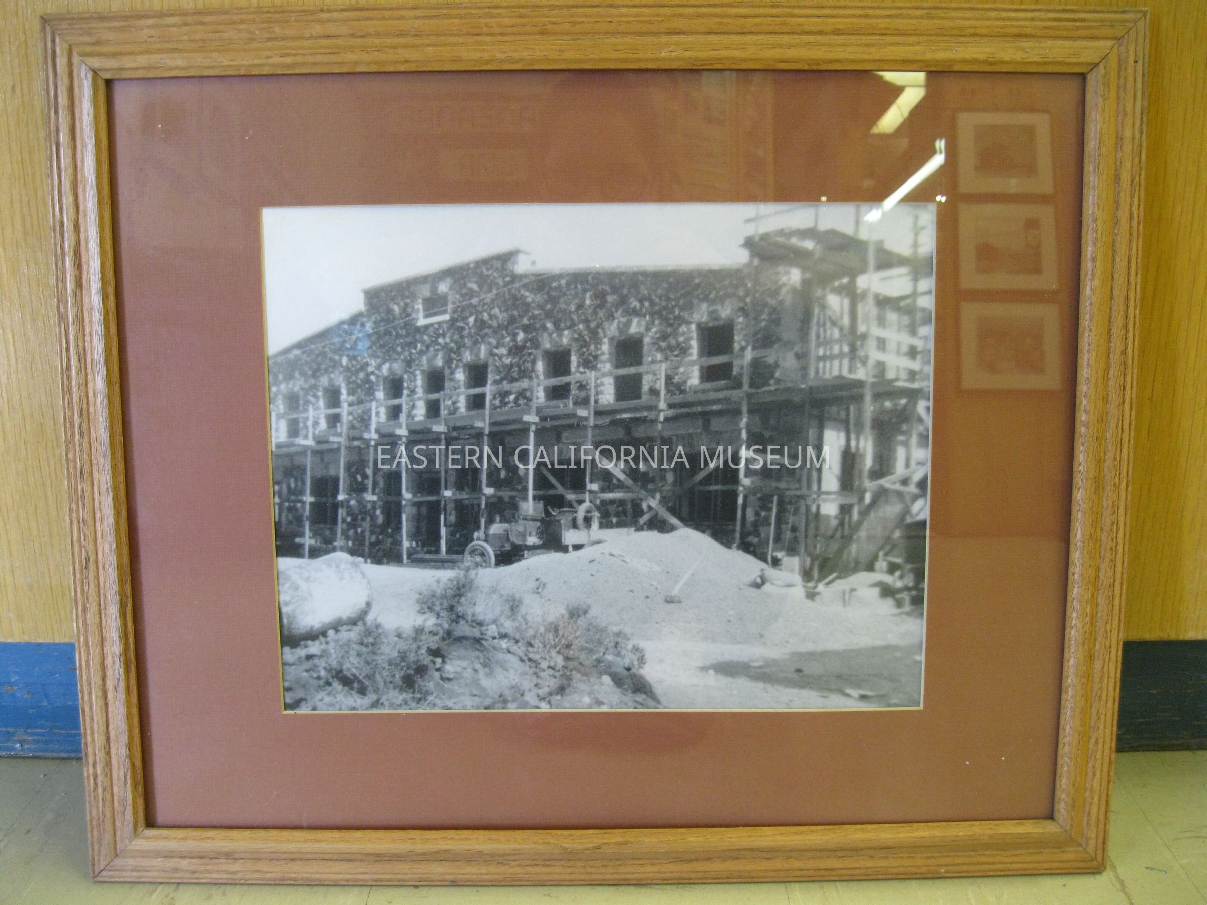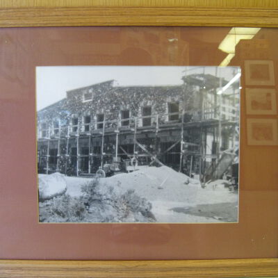 Framed photo of the Little Lake Hotel under construction in 1913. The photograph shows the front of the hotel surrounded by scaffolding. There is also a vehicle and a sand pile in the center of the photograph.Photograph Details