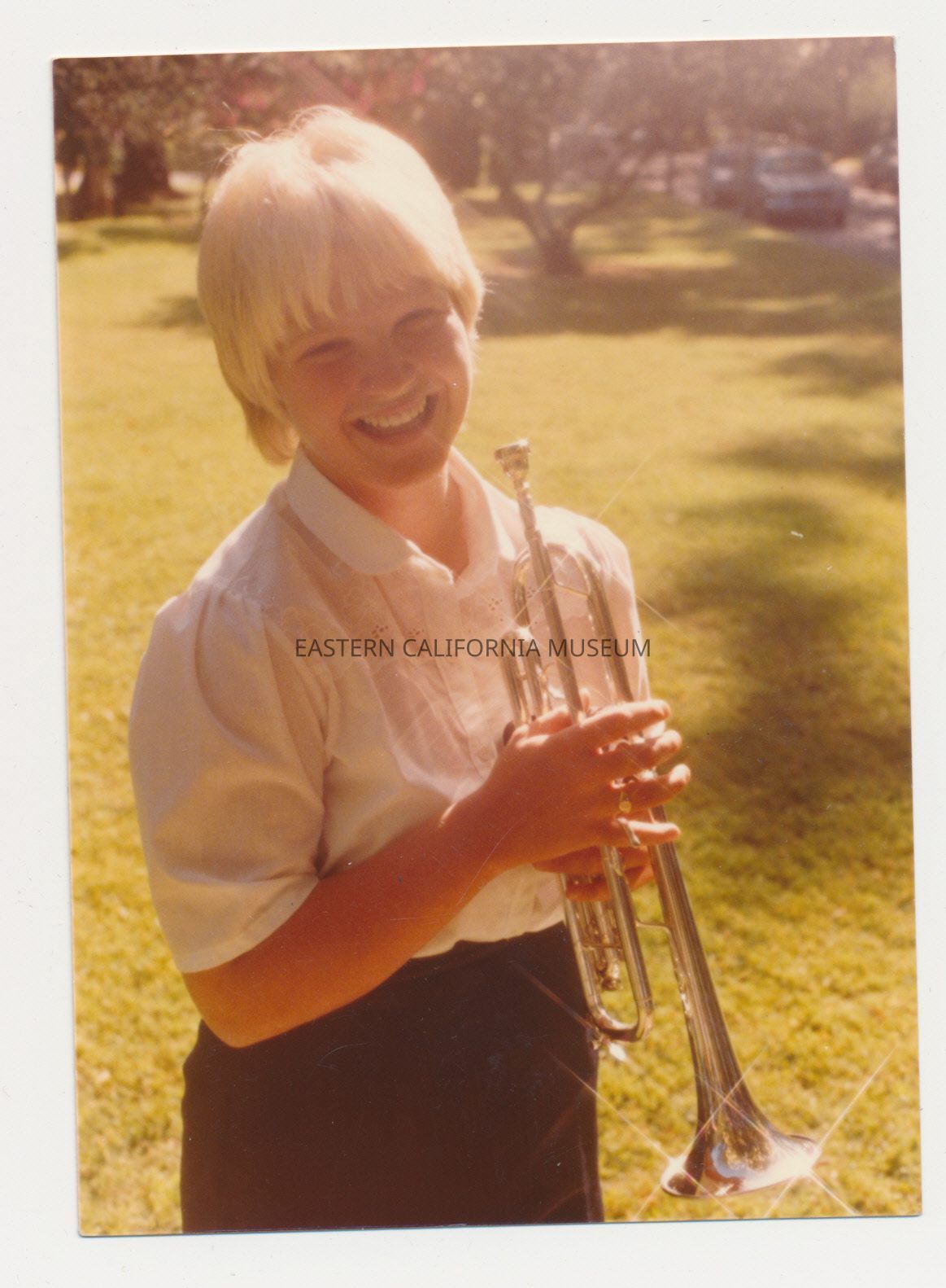 Color photo of Julie Marie King, granddaughter of Ora Smith, holding a trumpet. Photo was taken in 1983 when she was 15 years old.