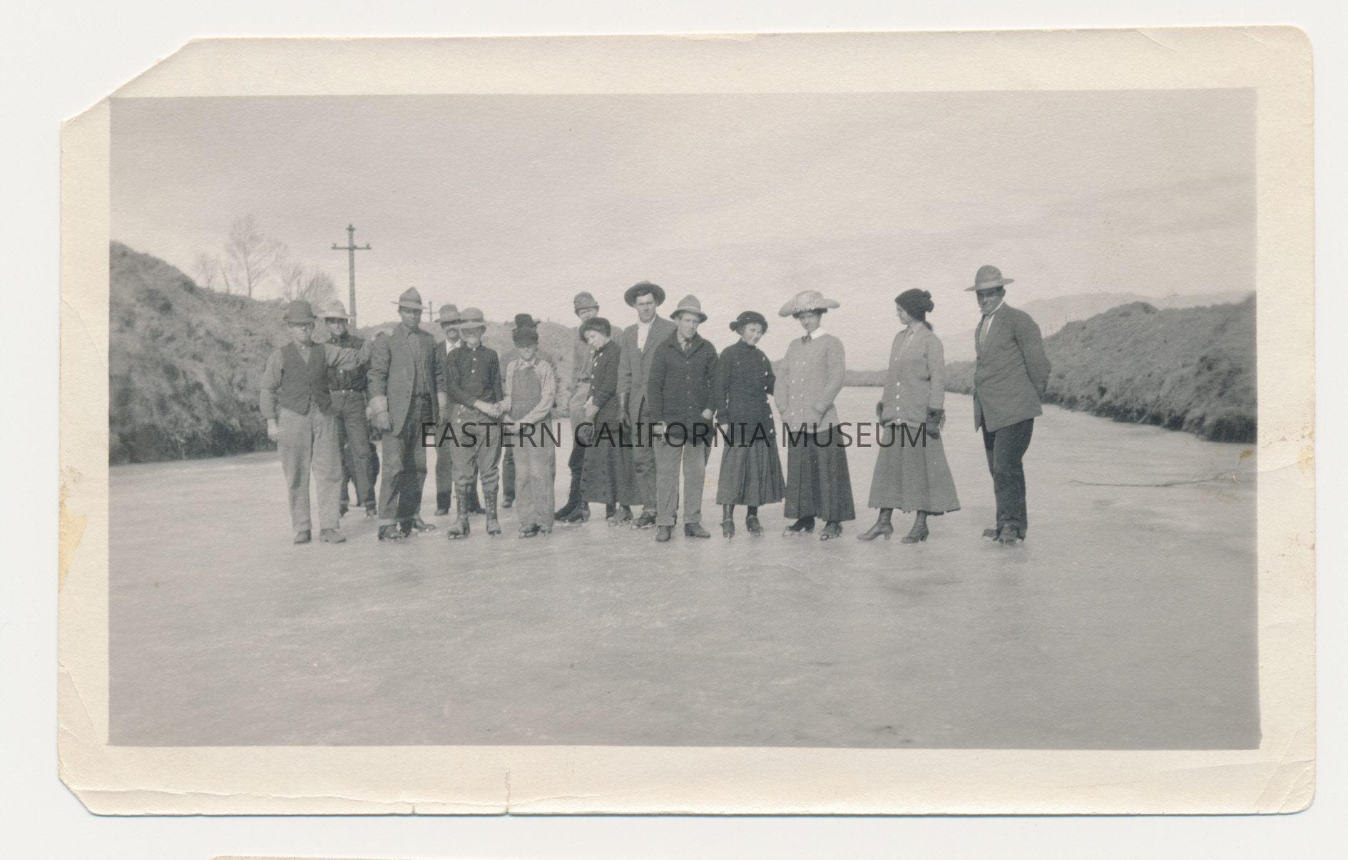 The accession paperwork says this was taken in 1916 when the aqueduct froze over, but the caption from the book "Mountains to Desert" identifies this a December 1913 skating party on the newly completed Los Angeles Aqueduct (near Manzanar). Another photo in the museum gives the date as Christmas 1911.Collection