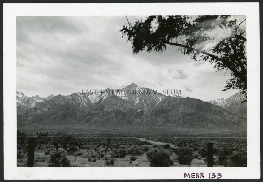 Photograph of Mount Williamson with view of the desert in the foreground and a tree branch in the upper right. The barbed wire can be seen running along the lower section of the photograph. The line of trees in the background is the north fork of Bairs Creek.Collection