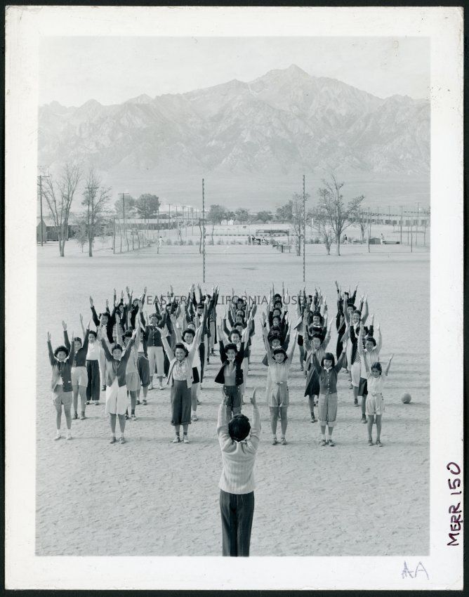 Photograph by Ansel Adams (?) of teenage girls being led in calesthenics by a caucasian instructor at Manzanar, Mt. Williamson can be seen in the background. They all have their hands stretched overhead.