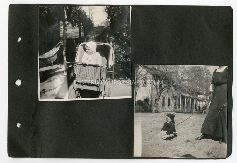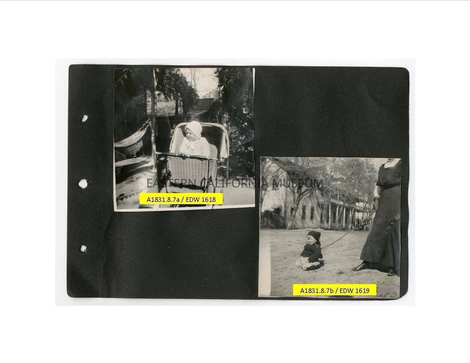 A1831.8.7b: Exterior photo of a toddler sitting in the middle of a dirt road crying. A woman off to the right is holding a leash which is attached to the child. The Norman House (hotel) may be in the background.Collection