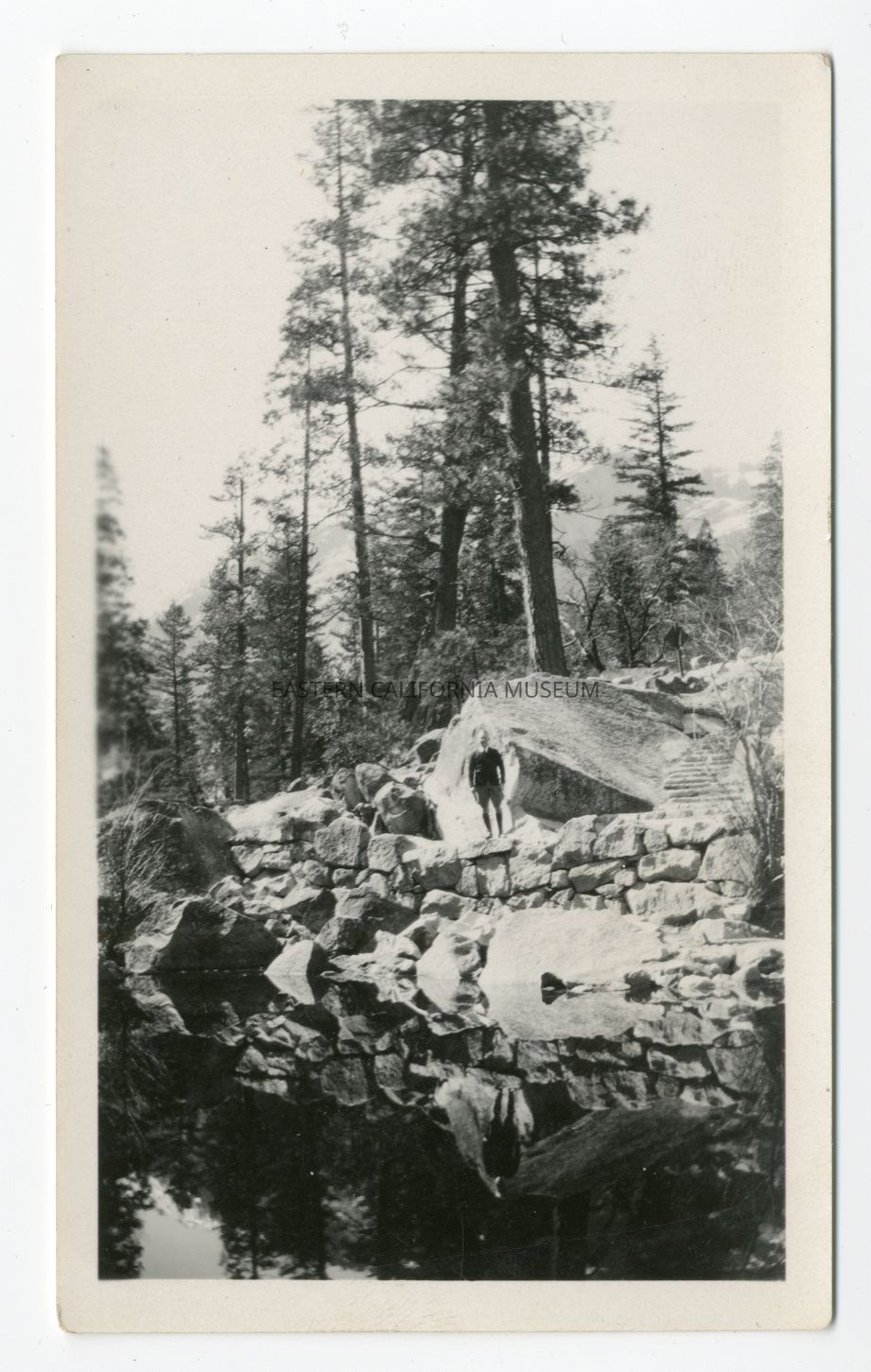 Photo of a man standing at the edge of a stone wall by a pool/pond/lake. Stamped on reverse: 578
