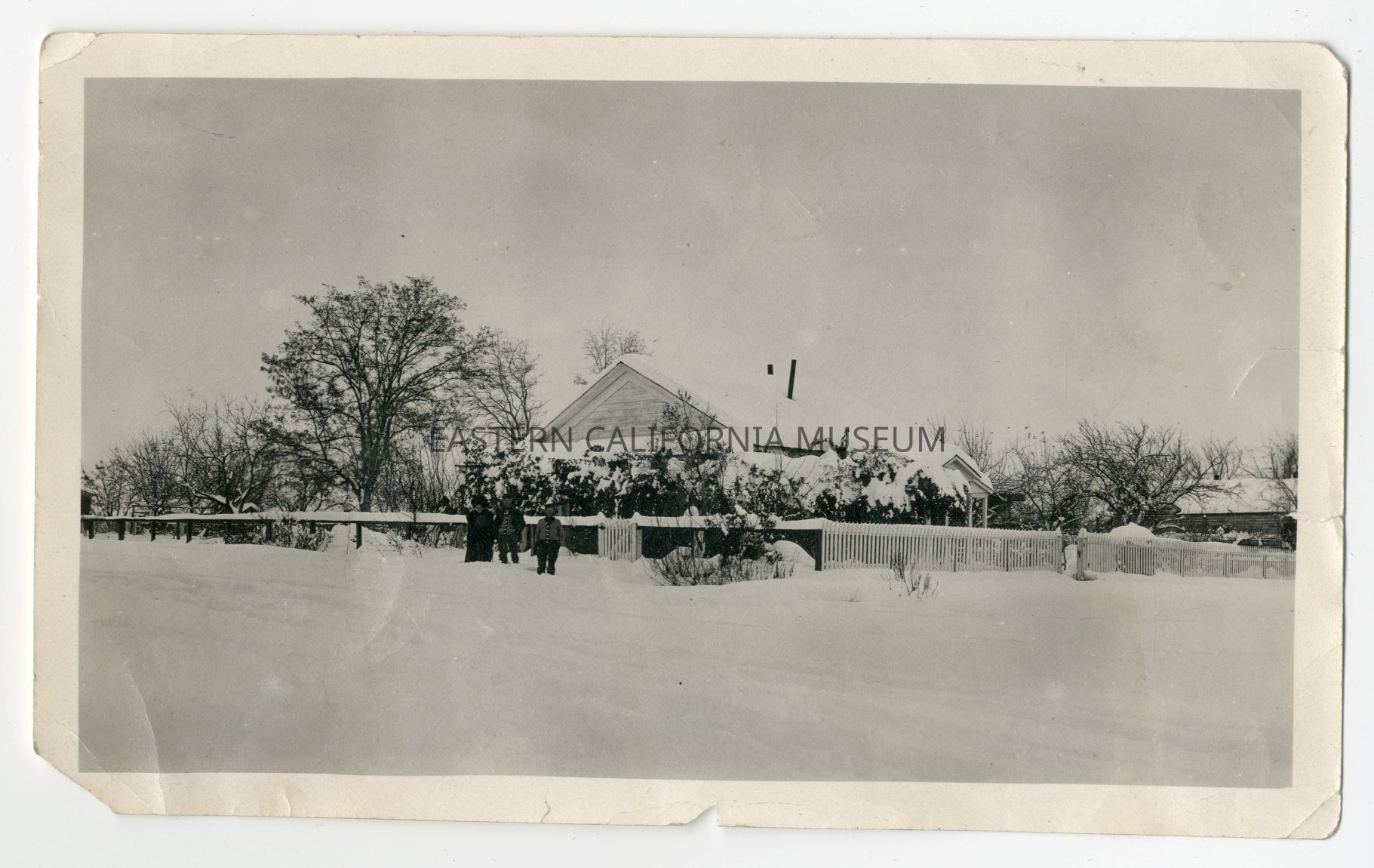 Exterior photo of a house blanketed under snow. There are three people standing in front of it.