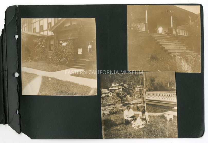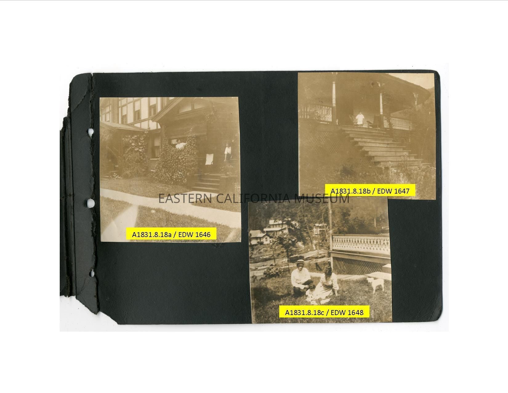 A1831.8.18c: Exterior photo of a man, woman, and child sitting in the sloping yard. Other houses, porch, and a dog are visible.Collection