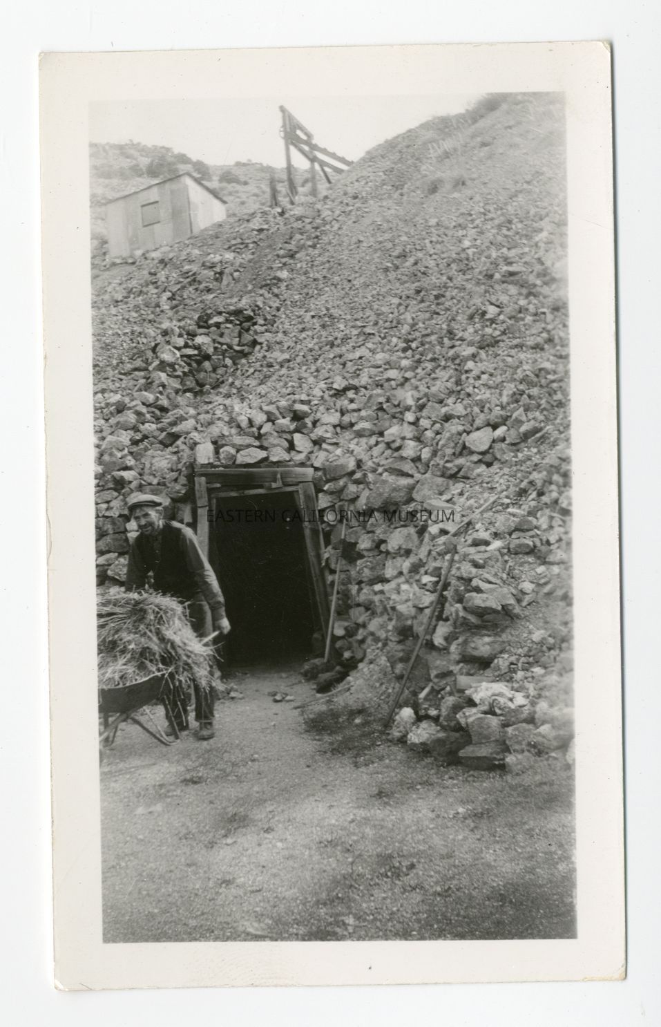 Exterior photo of a man pushing a wheelbarrow full of hay. There is a mining tunnel or shaft behind him and a building at the top of the hill.