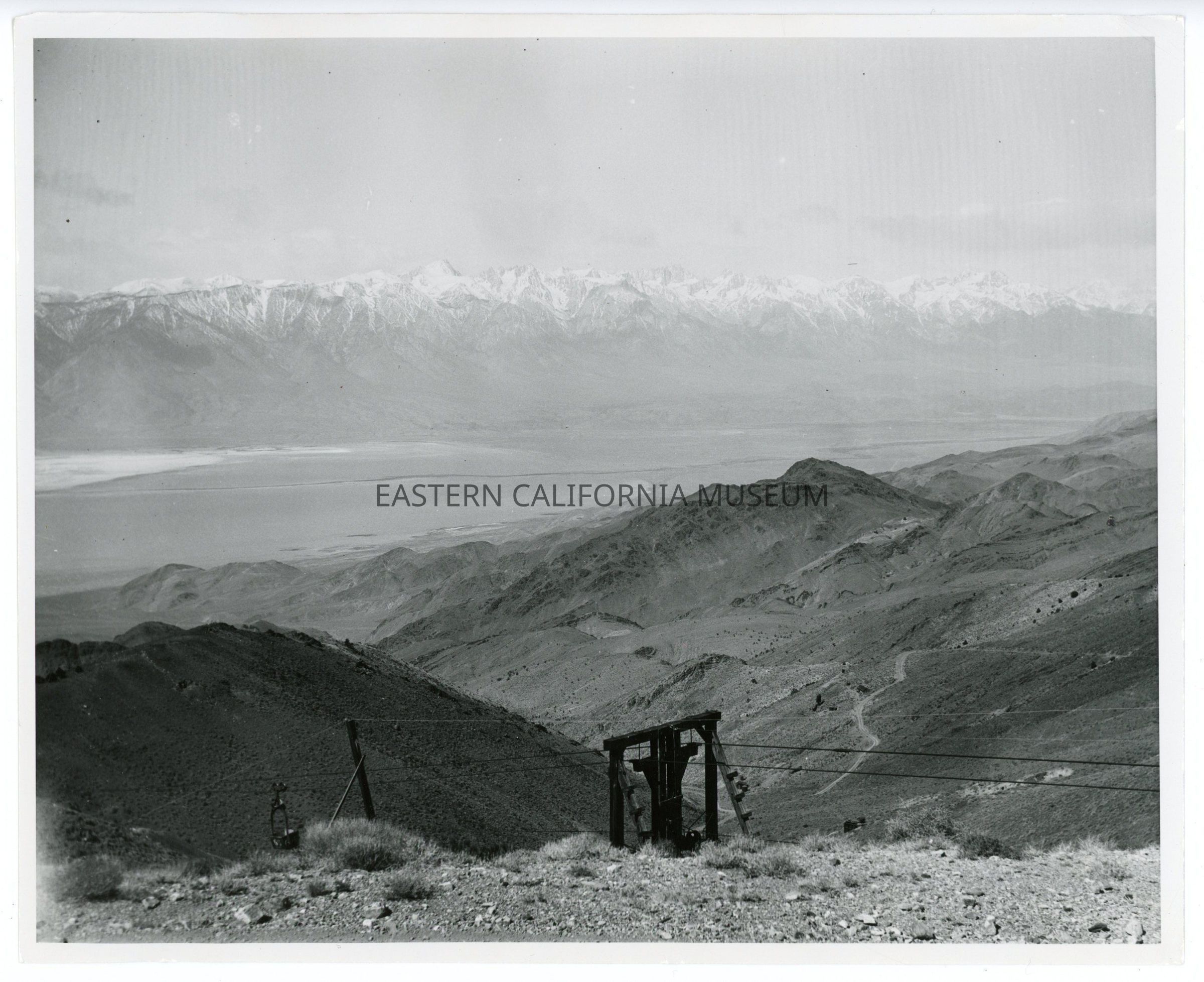 Photo taken from the Inyo Mountains looking west toward the Sierra Nevada mountain range. The Keeler-Cerro Gordo tramway is in the foreground. One tower and a bucket are visible.