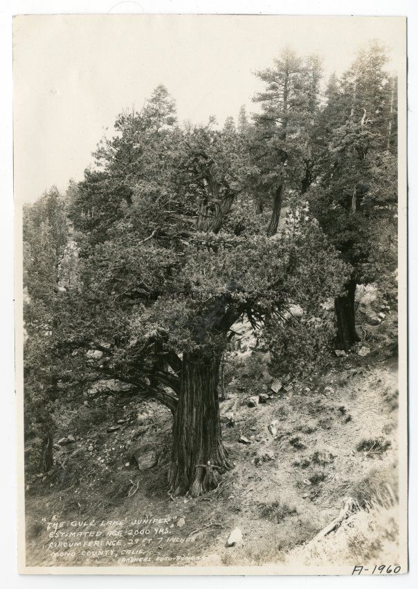 "The Gull Lake Juniper" Estimated Age 2,000 Yrs. Circumference 29 Ft. 7 Inches Mono County Calif. Frashers Foto Pomona A-1960