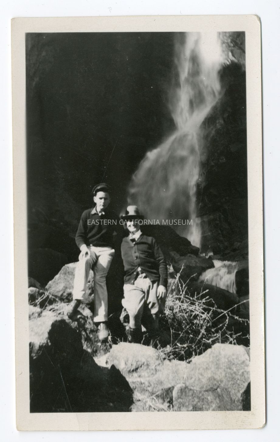 Photo of two people posing at the foot of a waterfall. Stamped on reverse: 578