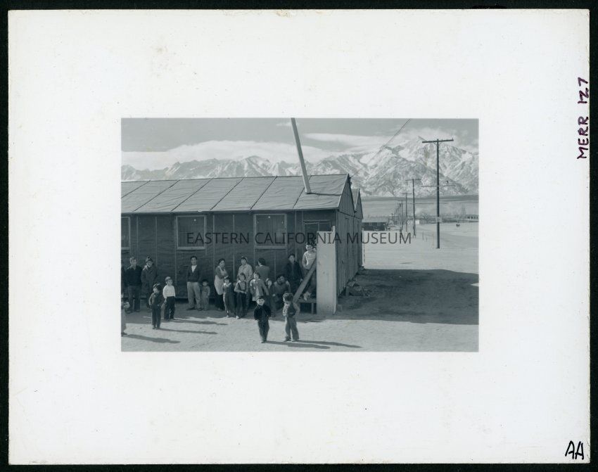 Photograph of school children and adults standing in front of a building (possibly a school or barracks) at Manzanar. The Sierra Nevada are in the background with a line of power poles receding toward Mt. Williamson.