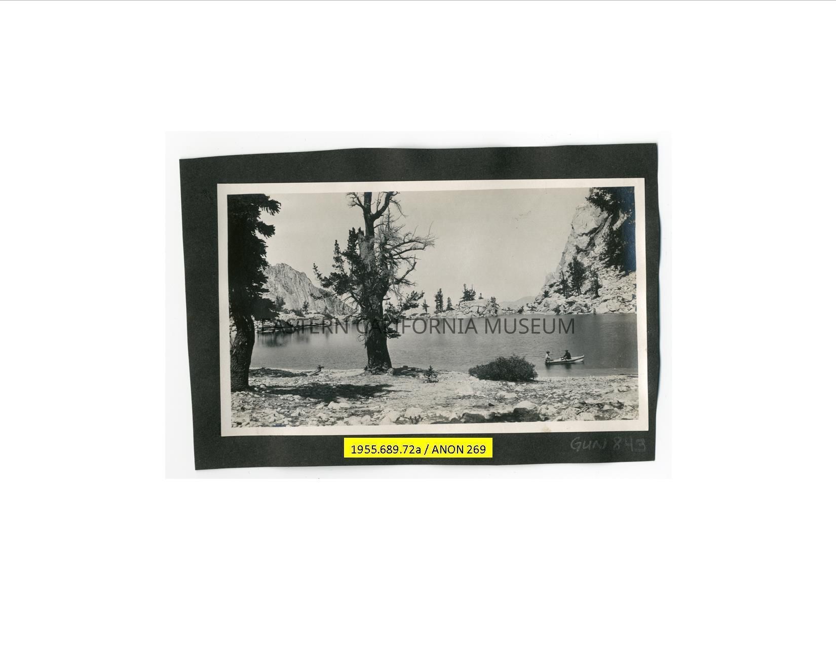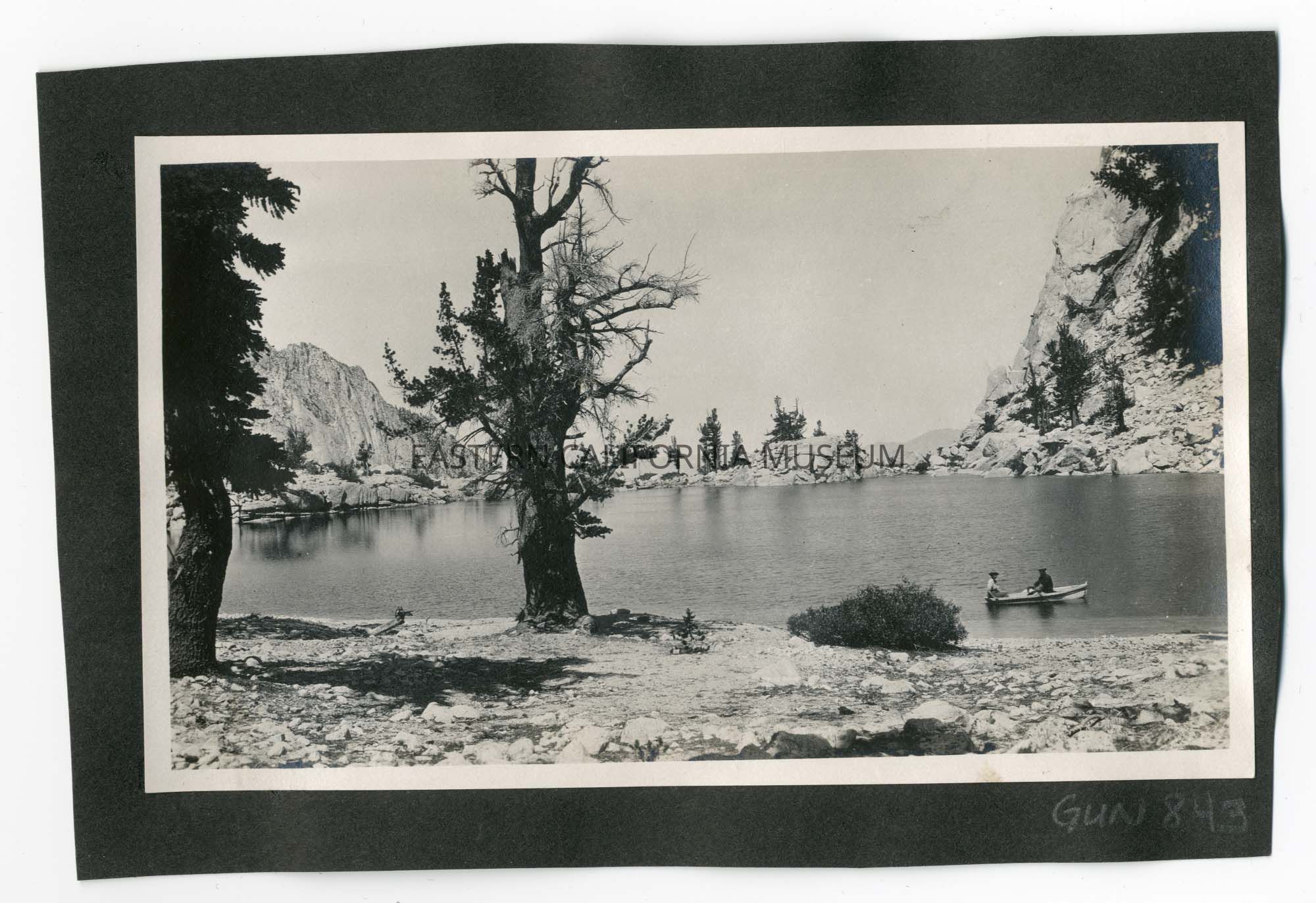 Photo of a boat with two people in it on a mountain lake. The location has been identified as Lone Pine Lake.