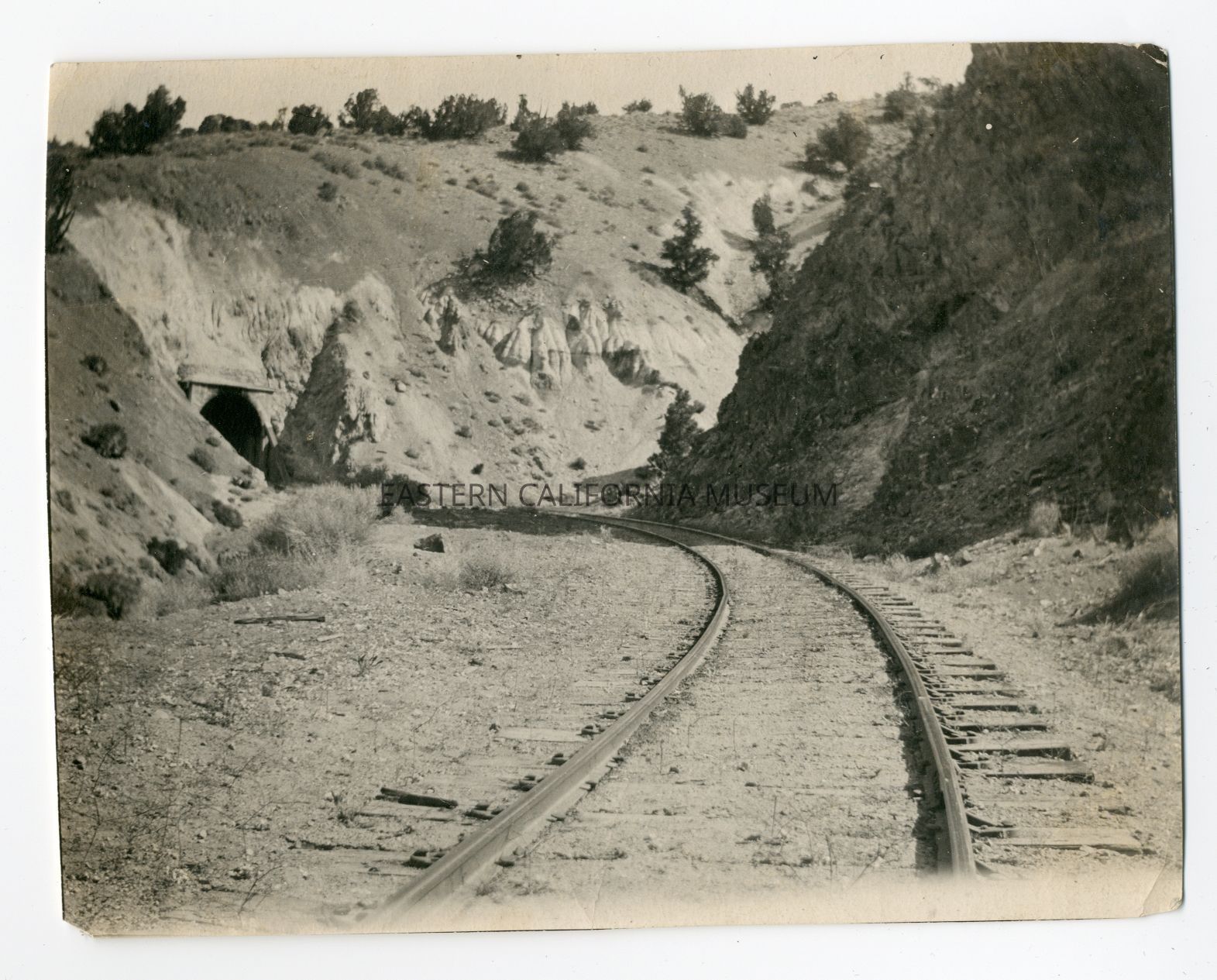 Exterior photo of railroad tracks leading around a curve to a tunnel. It is identified on the back as the tunnel near Queen.