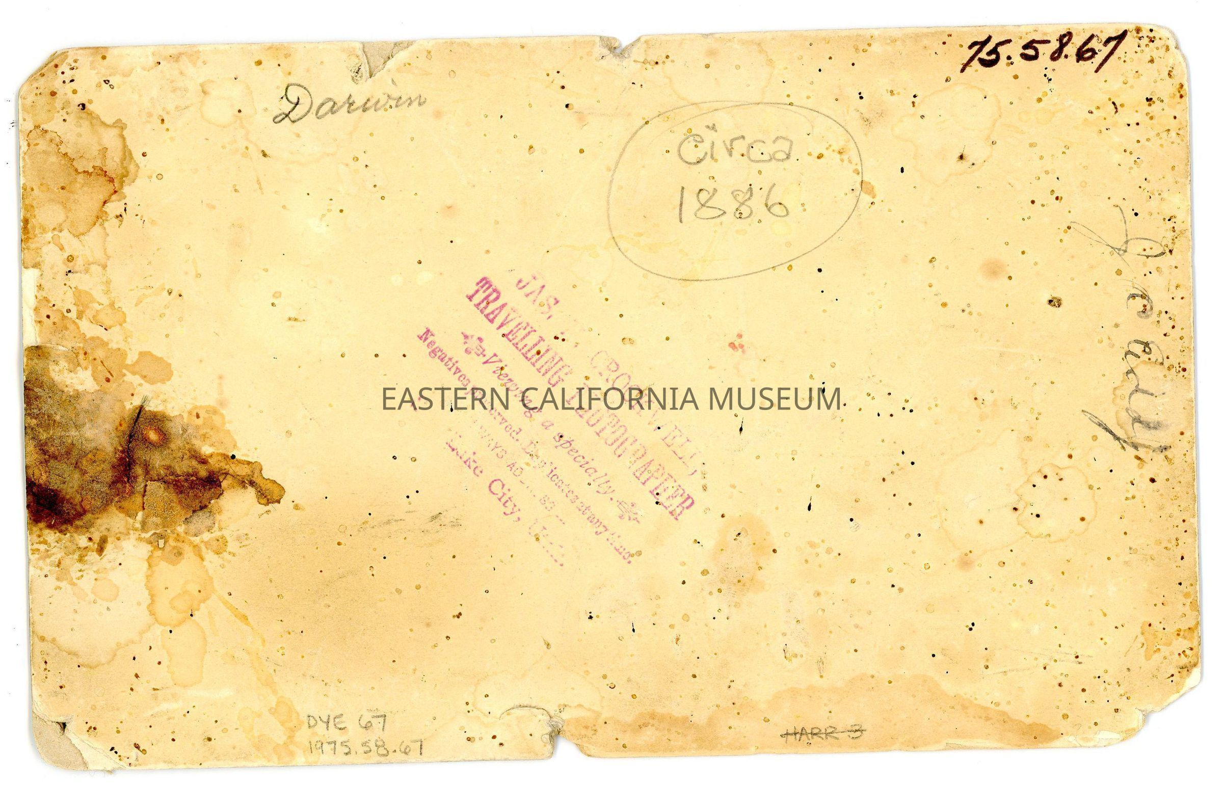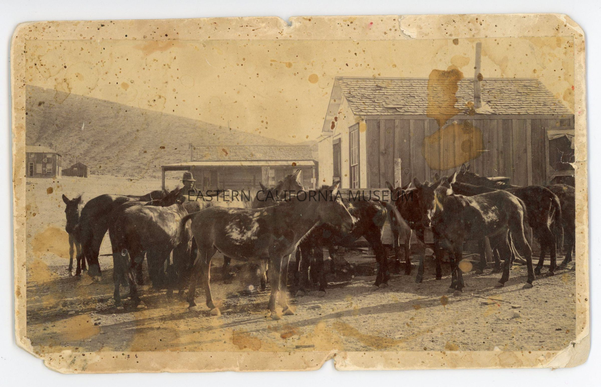 Mounted photo of a herd of horses or mules in Darwin taken by travelling photographer Crockwell of Salt Lake City, Utah. There is a man standing behind the animals and several wooden buildings in the background. This photo may date to circa 1886.