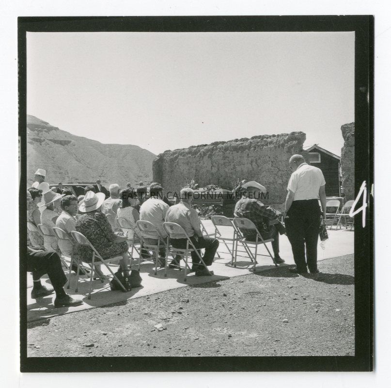 Small, square photo of seated and standing mourners at the funeral of Charles Ferges (Seldom Seen Slim) in Ballarat, 1968. Slim's coffin can be seen in the center of the photo by the (adobe?) wall. A hearst is barely visible to the far left.Collection