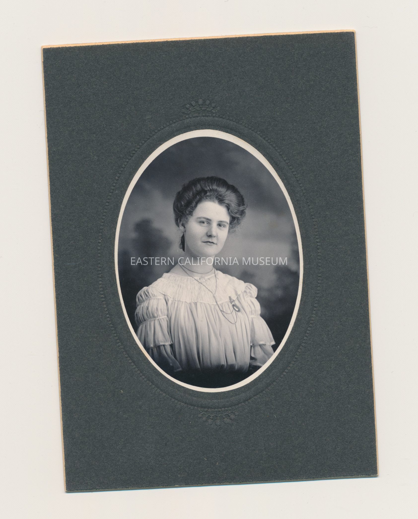 Mounted studio portrait of a young woman identified on the back as Mabel Hession.