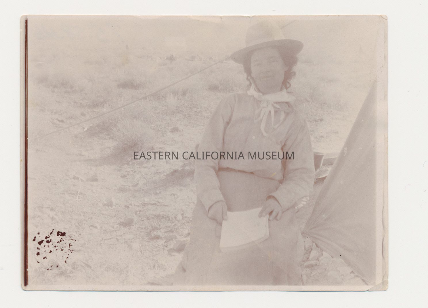 Faded photo of a woman sitting beside a tent with a book in her lap. Written in pencil on reverse: Mrs. Blanche Van Norman's sister.