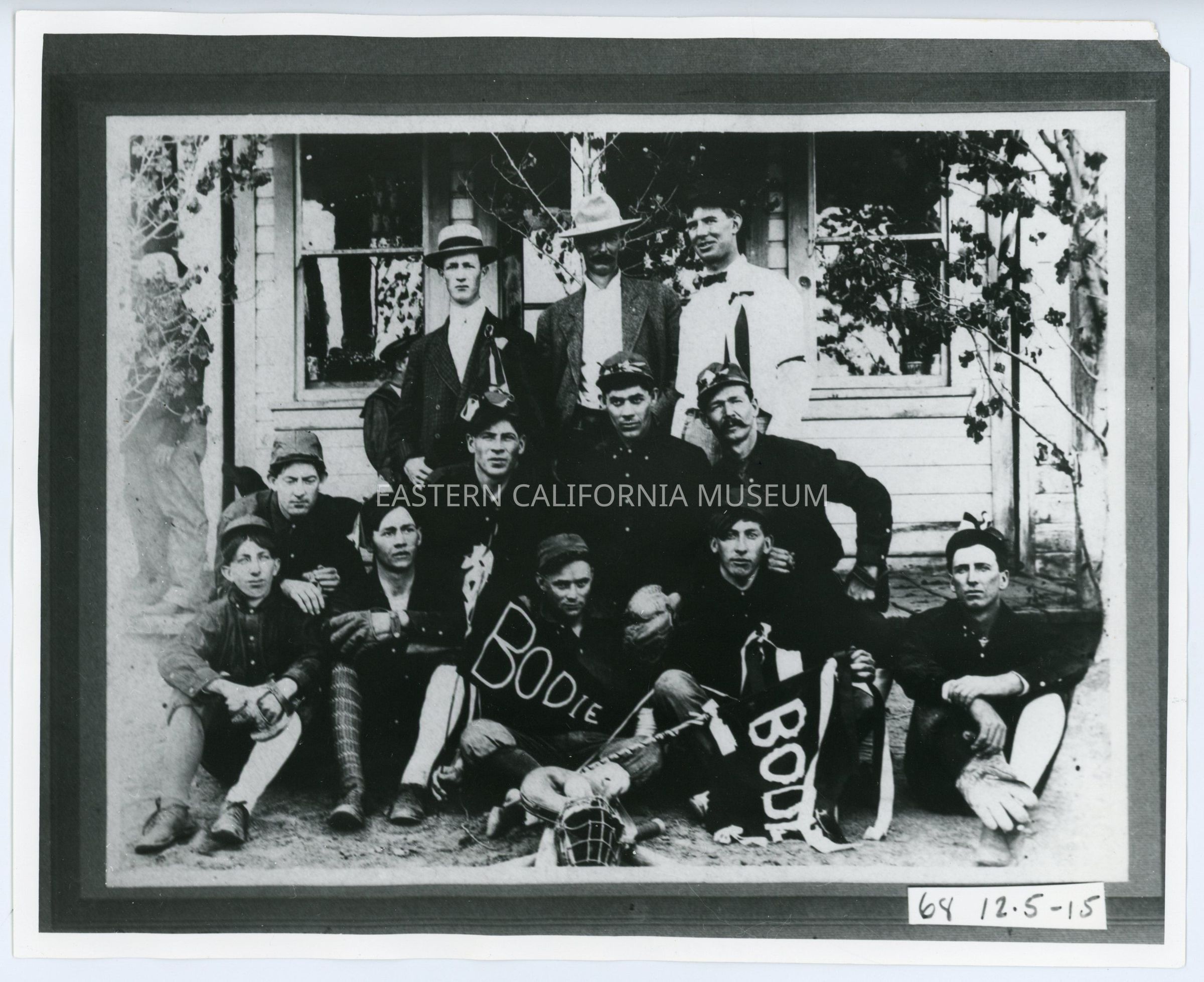 Copy of a photo of a group of men, two of whom are holding "Bodie" pennants. Several of them have baseball gloves, and there is a catcher's facemask and some bats in the foreground. Written in the lower right corner is "68 12 5-15." They have been identified as the Bodie baseball team in 1906. Standing third from left is William B. Evans, Sr., father of Sheriff W. B. Evans and Superior Court Judge Walter Evans.
