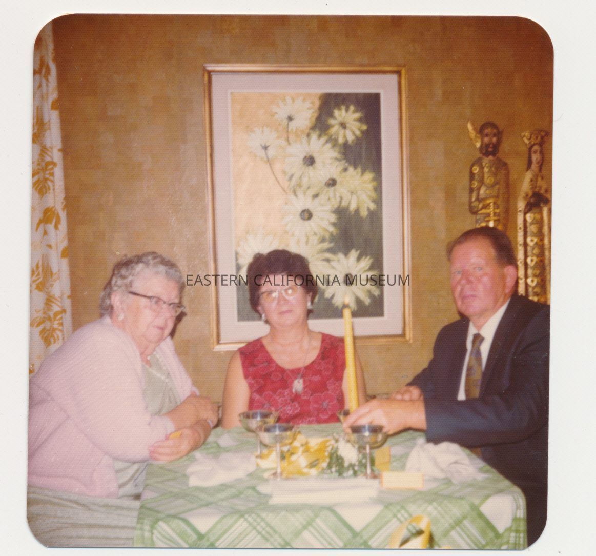1991.13.1.212--Ora Drew Smith, Ruth Drew Smith, and Dale Drew sitting around a dining table.