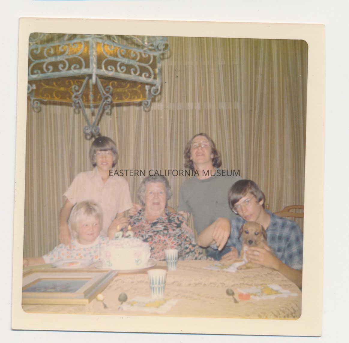 1991.13.1.214--Ora Smith, Julie King, Mark Smith, Roland Smith, Robert Smith, and dog Cindy. They are sitting around a table with a birthday cake--possibly Ora's 73rd birthday?
