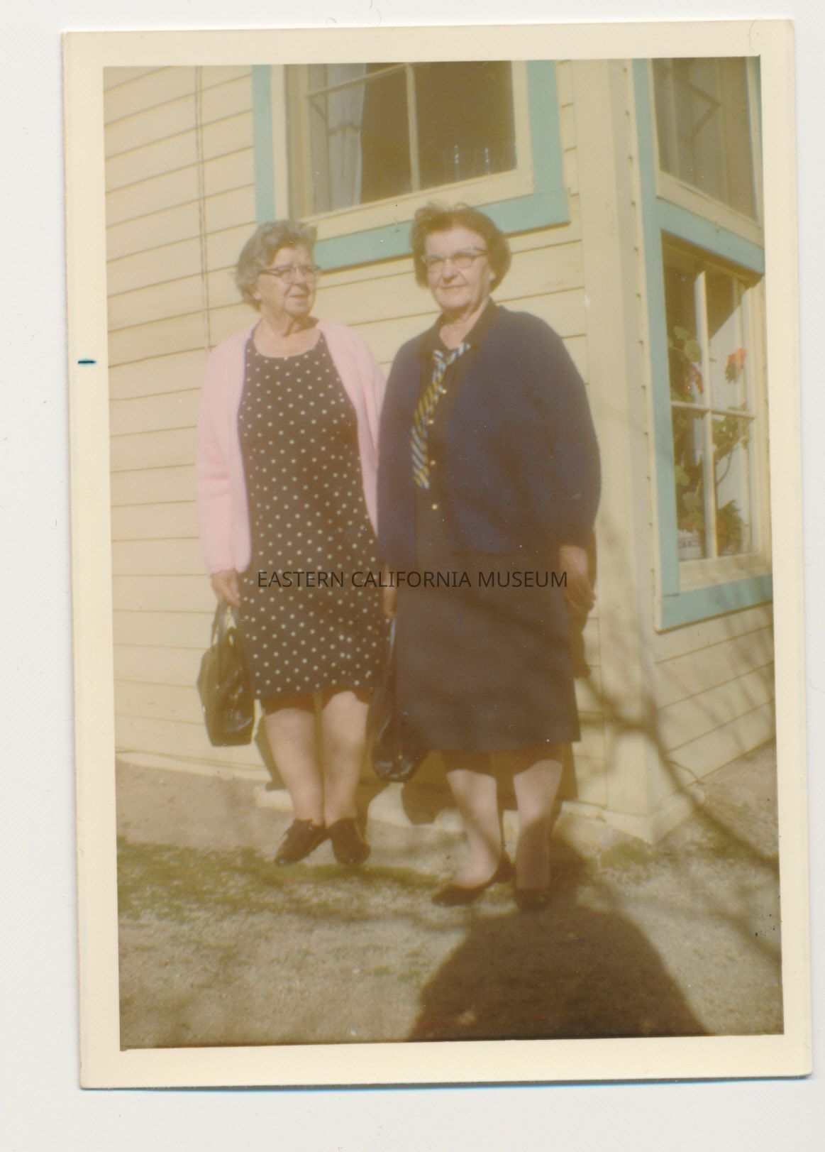 1991.13.1.215--Ora Smith and Elodie Drew standing in front of a building with light blue trim.Collection