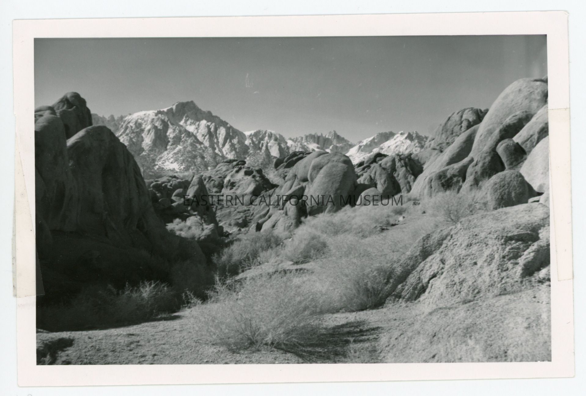 Handwritten in blue ink on reverse: Taken from Alabama Hills, Mt. Whitney Road. Left: Lone Pine Peak. Middle in distance: Mt. Whitney.