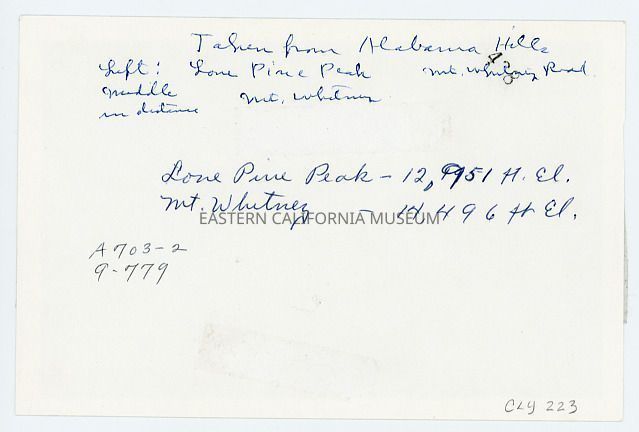 Information likely added by Elodie Drew on 04/09/1958: Lone Pine Peak--12,951 ft. el. Mt. Whitney--14,496 ft. el.Collection