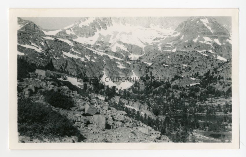 Black and white photo of a mountainside with a lake in lower right. Lots of rocks, trees, and snow.