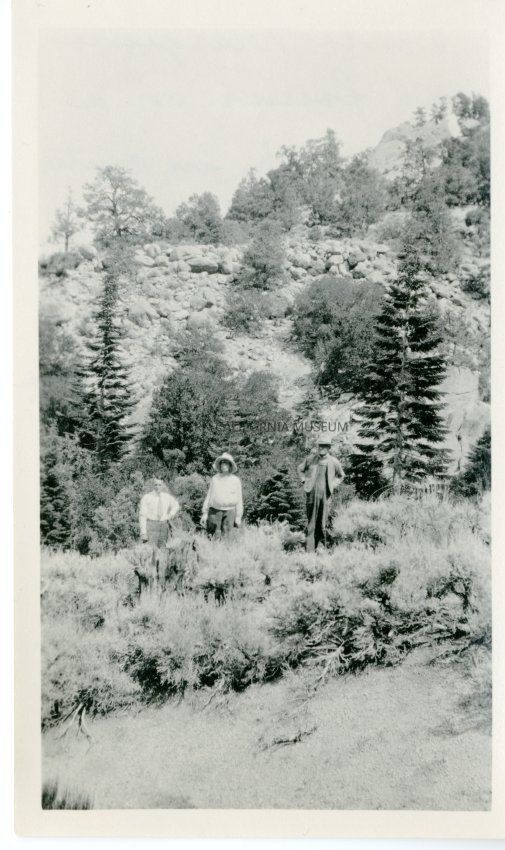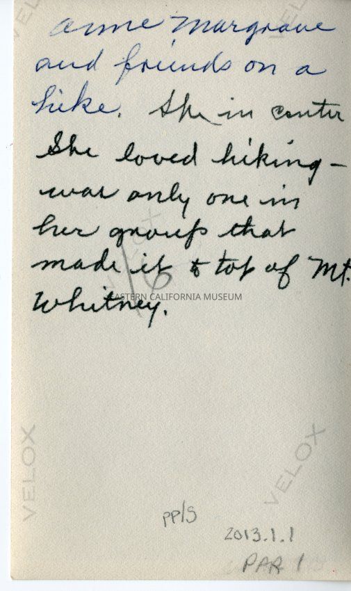 Written in ink on reverse: Anne Margrave and friends on a hike. She's in center. She loved hiking--was only one in her group that made it to the top of Mt. Whitney.Collection