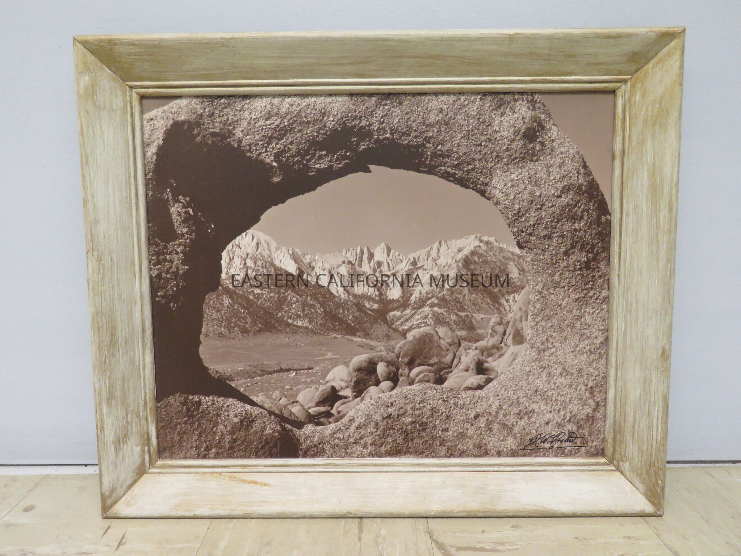 Framed photograph taken by the donor, Ralph W. Posten, of Mount Whitney through an arch in the Alabama Hills. It is signed in the lower right corner with "R. W. Posten."Photograph Details