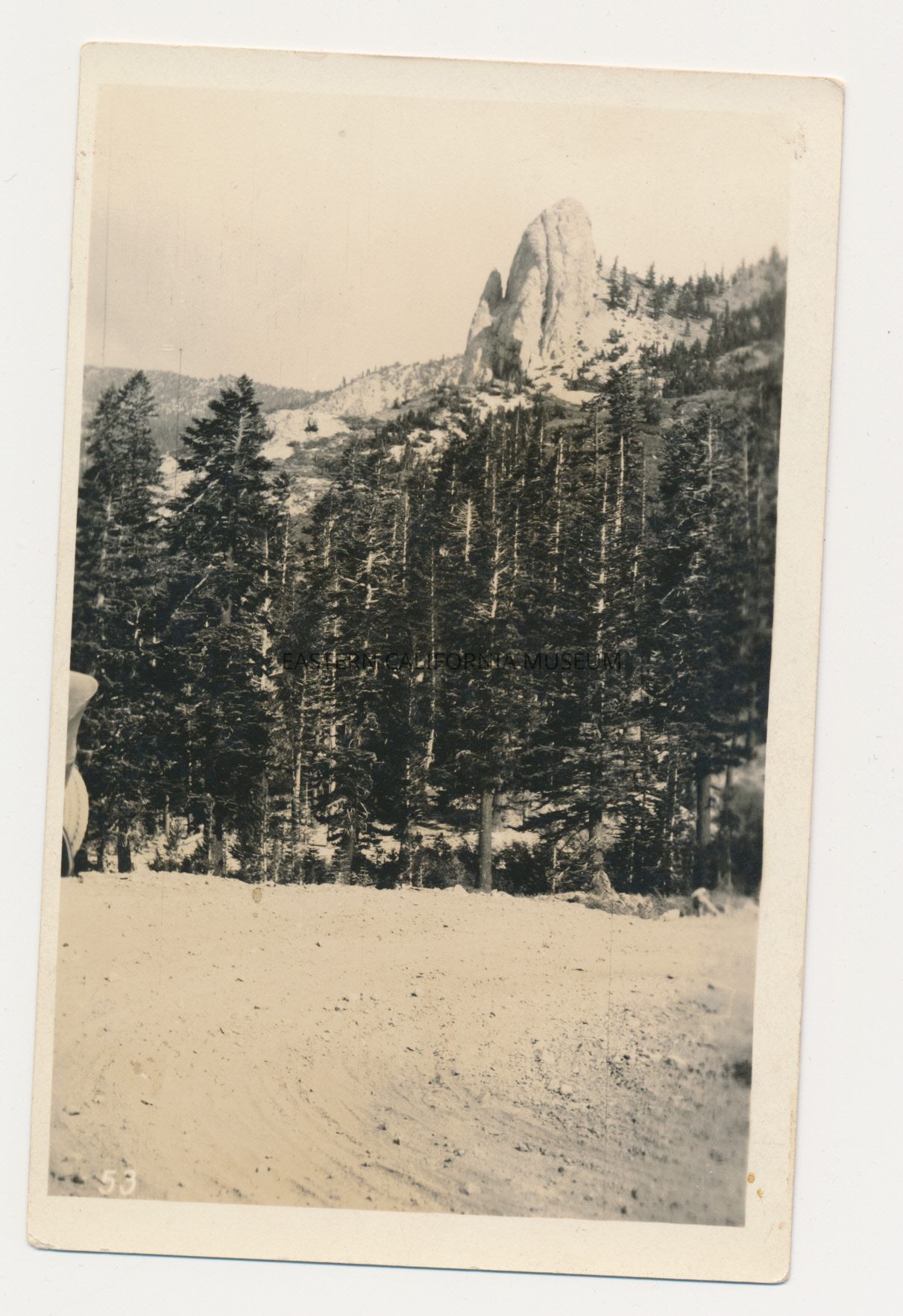 Photo postcard of a dirt road in a forested mountain landscape. There is a striking stone monolith rising above the trees. Written in lower left corner is "53."Collection