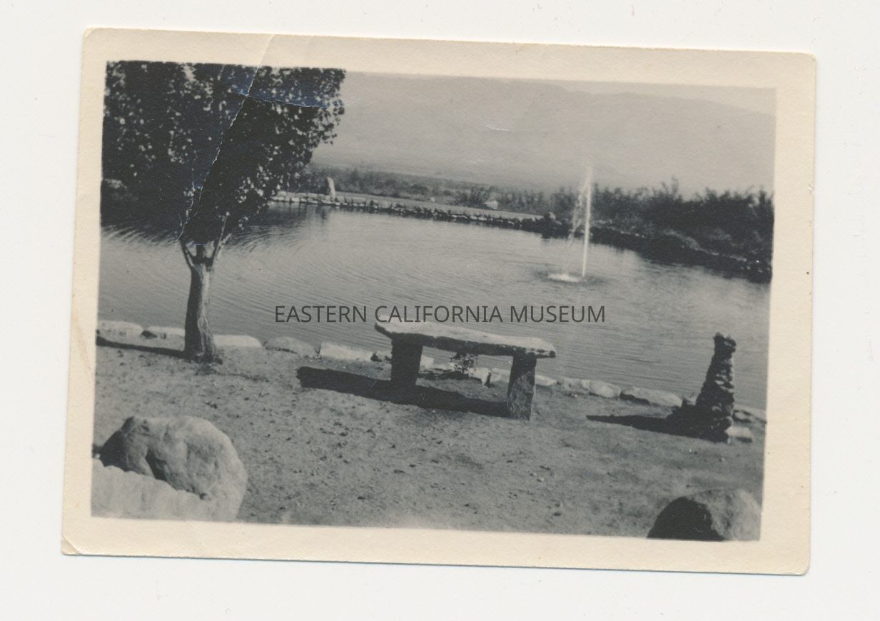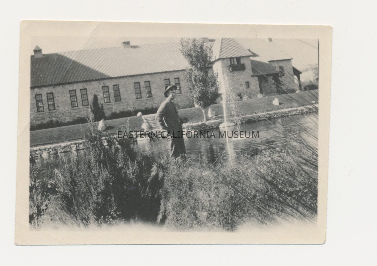 1991.13.1.230--Grover Smith standing in front of pool, fountain, and hatchery.