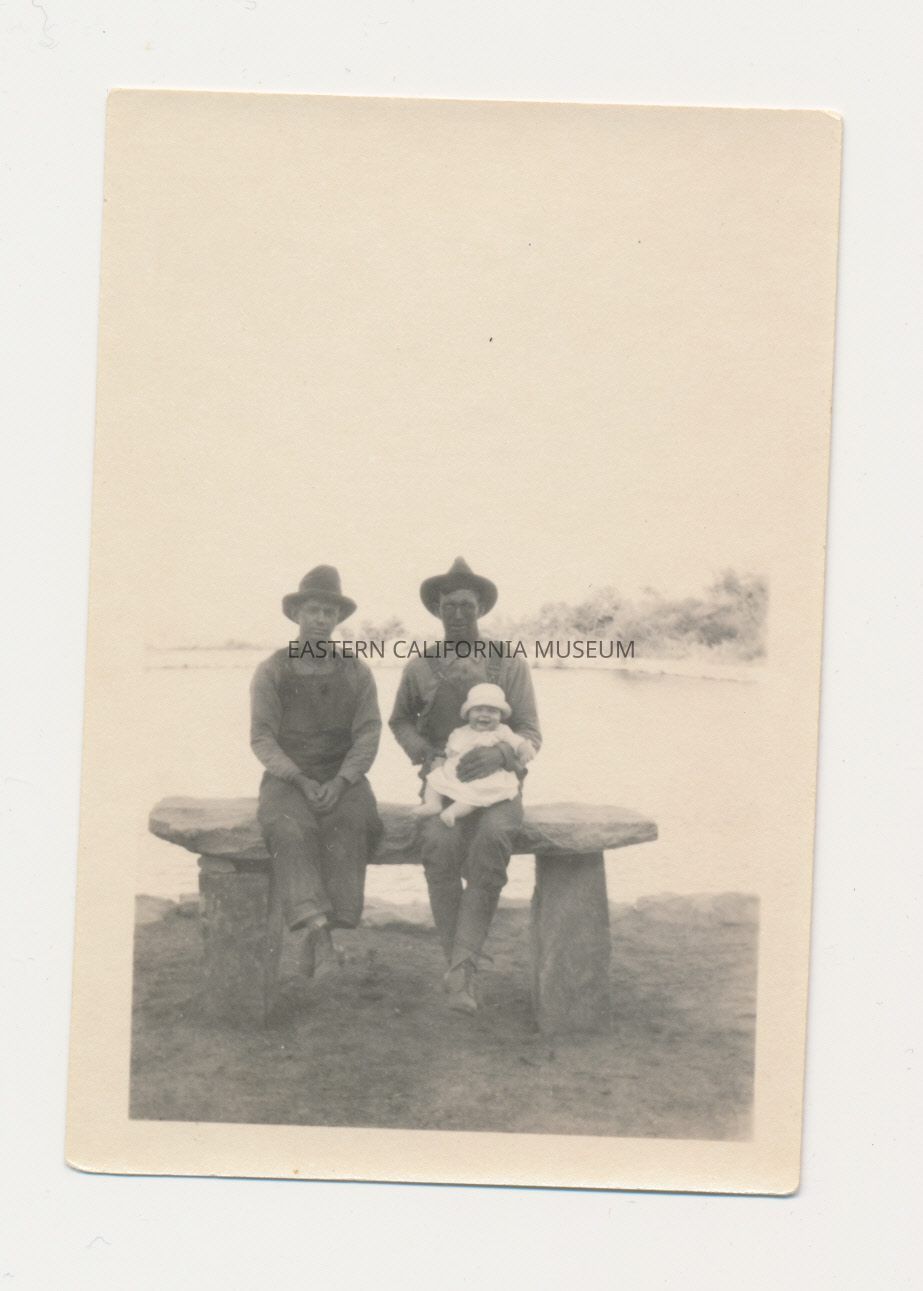 1991.13.1.233--Two men and a baby sitting on the stone bench in front of the pool, 1925.Photograph Details