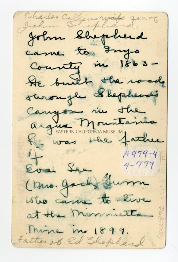 Writeen in ink on reverse: "John Shepherd came to Inyo County in 1863. He built the ranch through Shepherd's Canyon in the Argus Mountains. He was the father of Eva Lee Gunn (Mrs. Jack Gunn), who came to live at the Minnietta Mine in 1900."