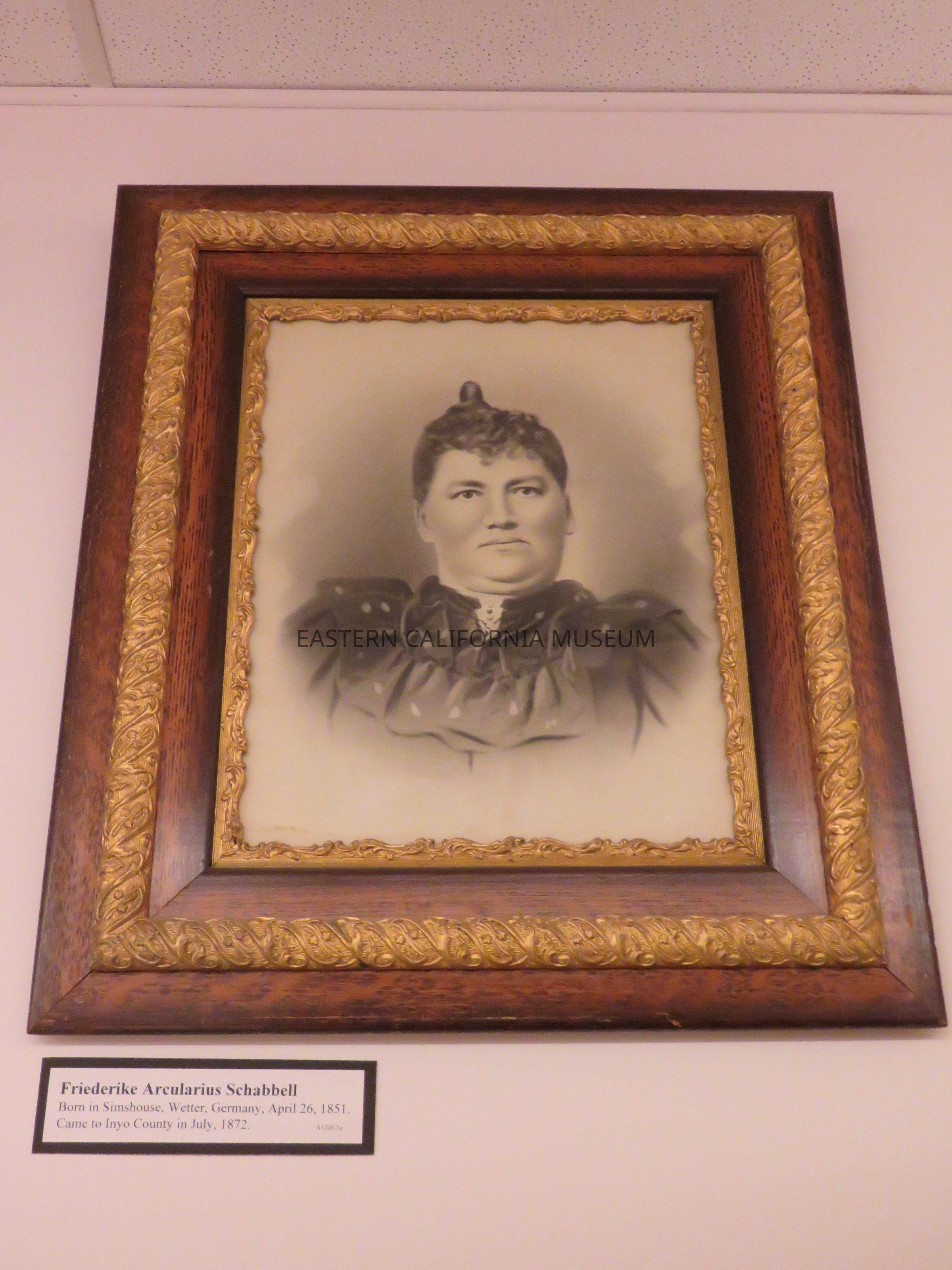 Large framed picture of Grandma Schabbell. She and her husband bought and homesteaded the Schabbell Ranch in 1874. The picture is in large hardwood frame with gold leaf trim. It was brought in from the Schabbell Ranch.Collection