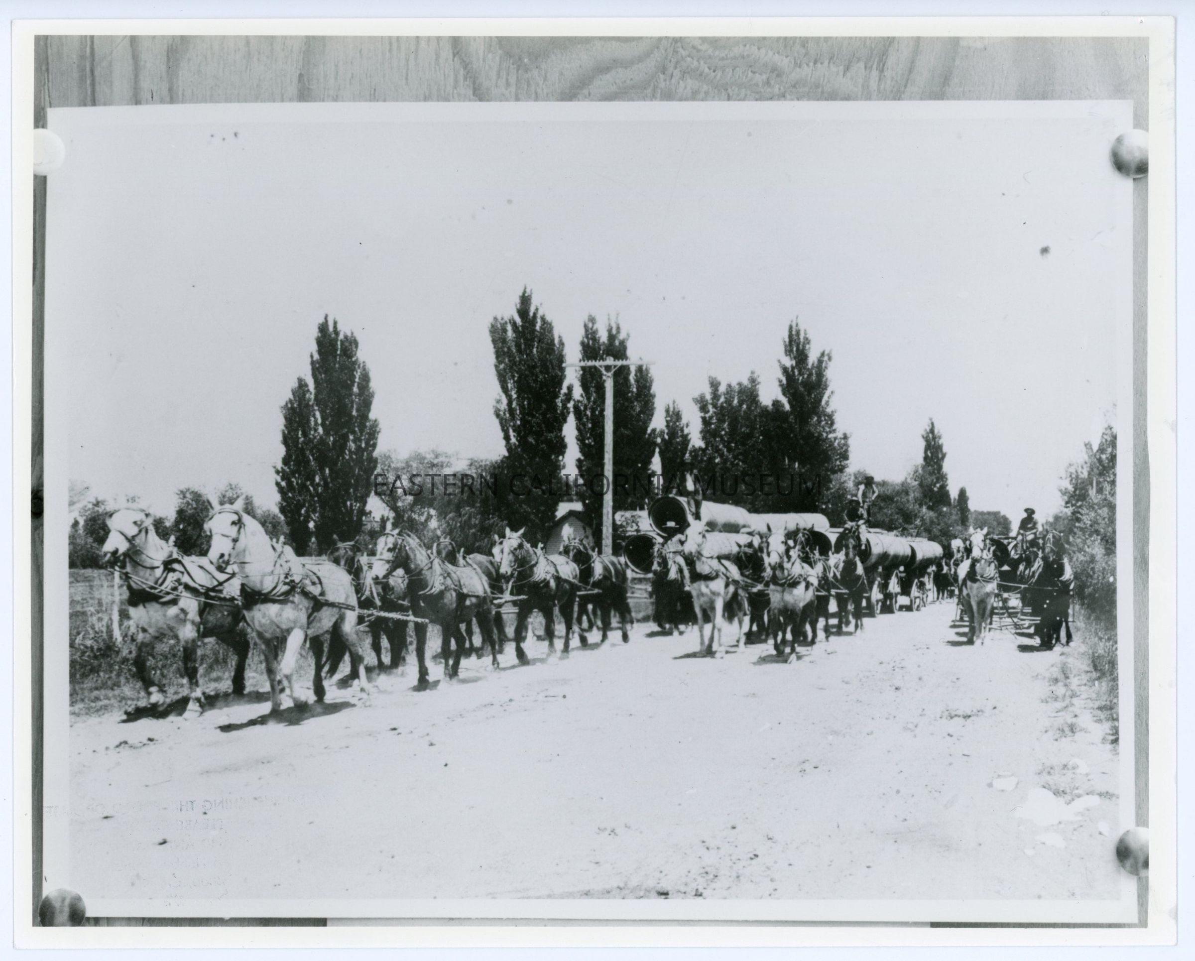 Copy of a photo of three teams of horses hauling wagons full of pipe (conduit?), likely for the Los Angeles aqueduct. It is stamped on reverse with the donors' information.Collection