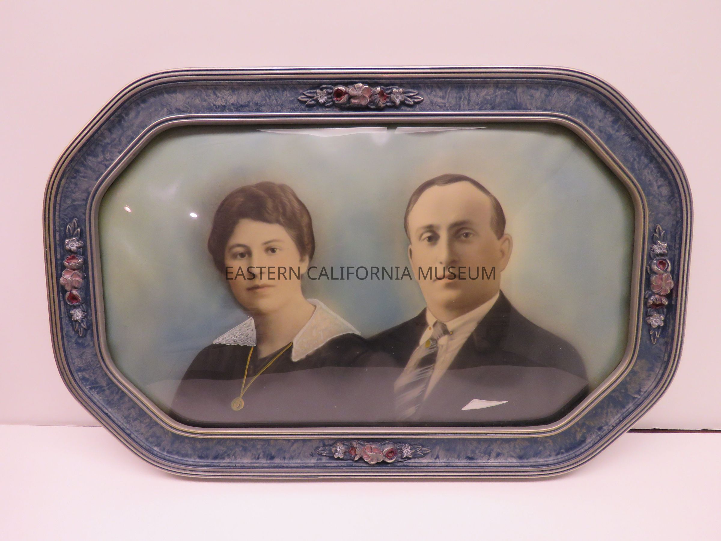 It is housed in an oblong octagonal wood frame whose edges are painted silver. The front of the frame is painted blue and slightly marbled. There are flower clusters decorating the four long sides; the center flower is pink and flanked on either side by red flowers with silver flowers and leaves on ends. The flower clusters are molded from an unknown material and applied to the frame. Curved glass covers the photo. It appears to be printed on a linen backed paper.Collection