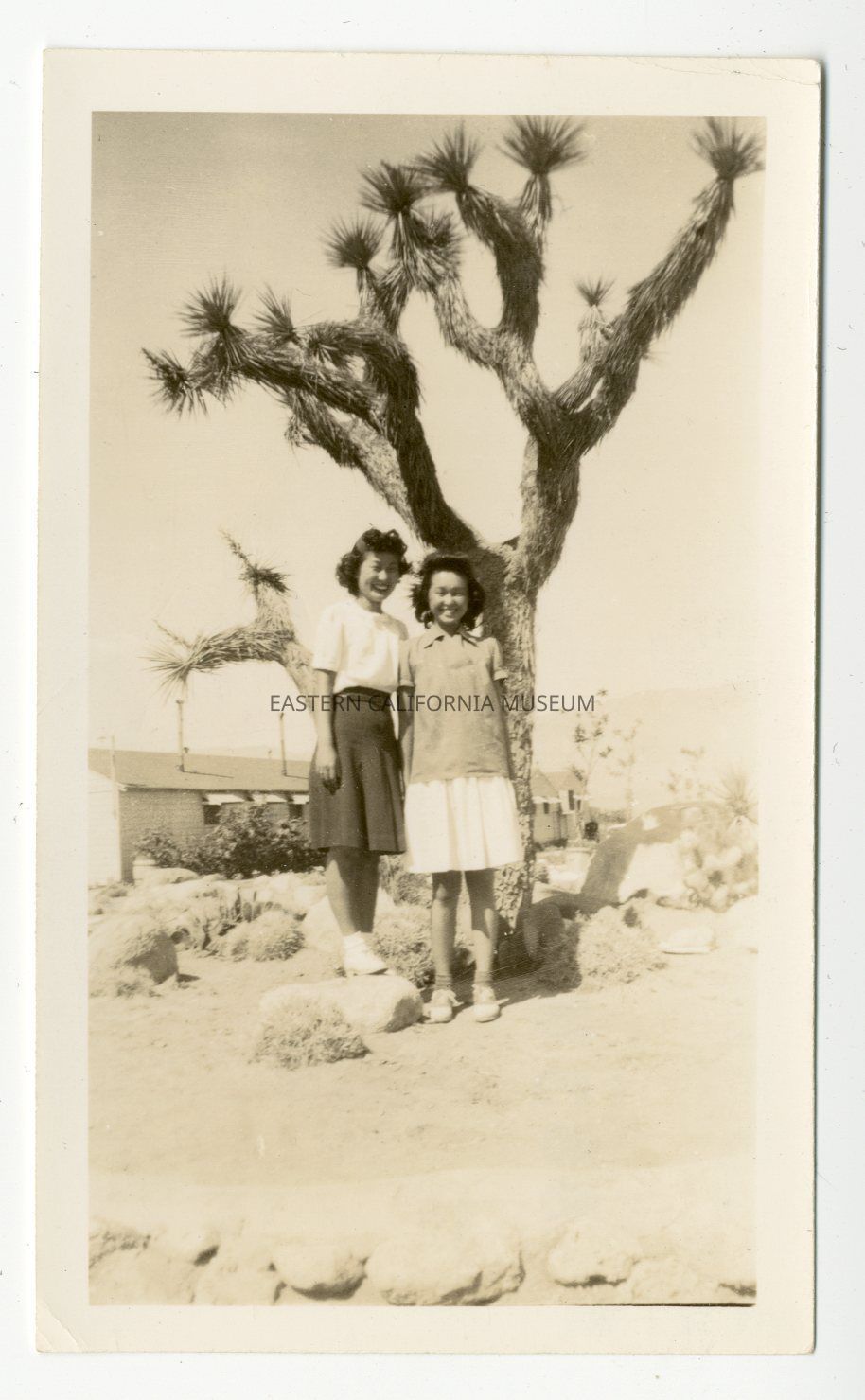 Faded b/w photo of two young women standing in front of a giant joshua or yucca tree. There is a long building in the background--not a barrack, maybe an administrative building or Caucasian Quarters?