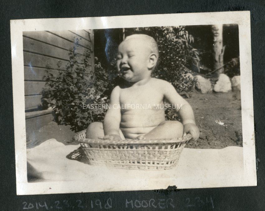 Naked baby sitting in a basket. House or other wooden structure in background.