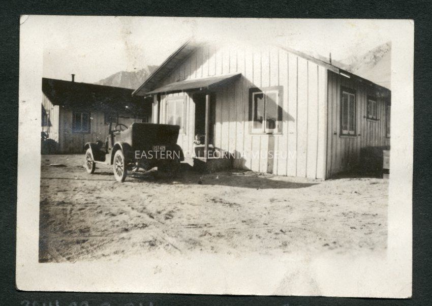 Wooden houses with a vehicle parked in front. Mountains just barely visible in the background.