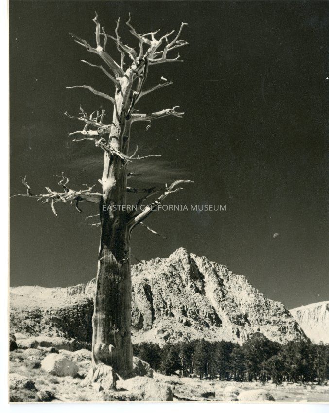 B&W. Bristlecone pine tree with mountain in the background and a half moon.