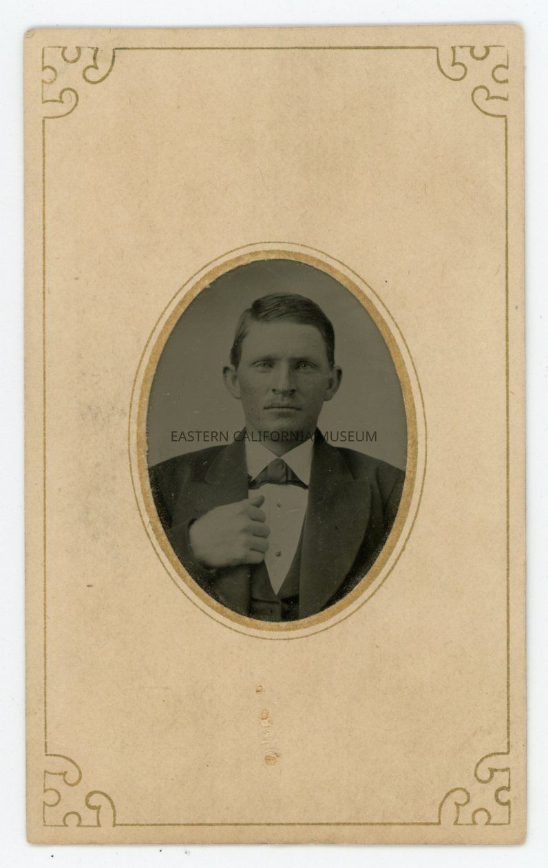 Studio portrait of an unidentified man cut down and taped to the back side of an oval mount. He is posed with his right hand holding his lapel.Collection