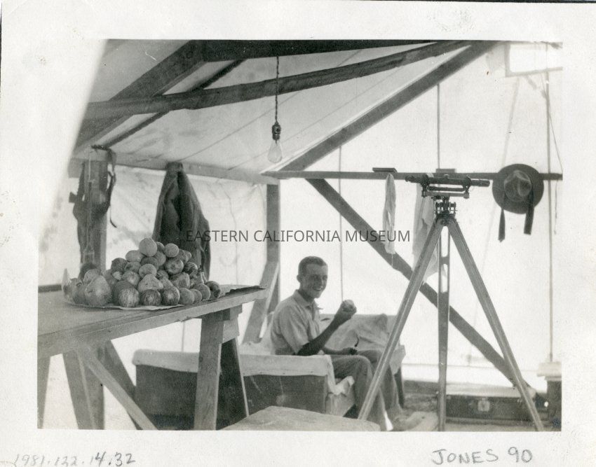 A member of the L.A. Aqueduct Survey Party in a tent cabin with food and surveying equipment.