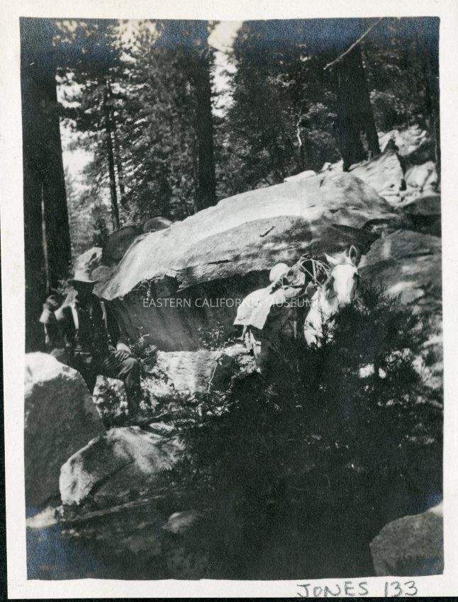 Packers and horses in a forest surrounded by large boulders, location unknown.