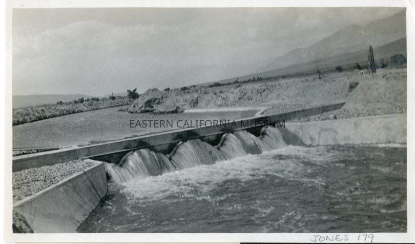 Coffer dam type structure, possibly built to divert water while constructing L.A. Aqueduct intake. Wooden tower at right corner may be well-drilling rig or a piledriver.Collection