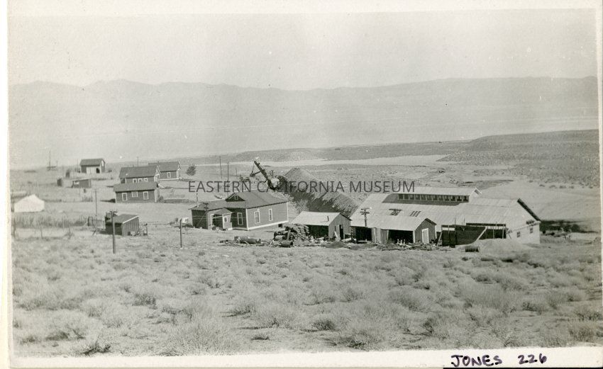 Cottonwood Power Plant and employee housing area. Marion steam shovel (in background) excavating channel on L.A. Aqueduct. Photo taken looking east to Owens Lake and Inyo Mountains.Collection
