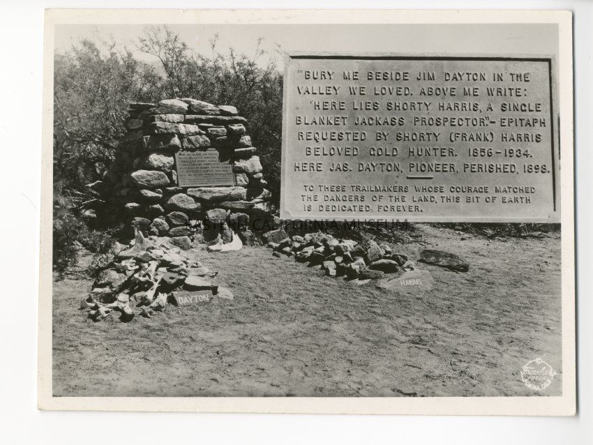 B&W. Graves, tombs, of Shorty (Frank) Harris and Jim Dayton in Death Valley. Plaque reading, Bury me beside Jim Dayton in the valley we loved. Above me write: Here Lies Shorty Harris, a single blanket jackass prospector.--Epitaph requested by Shorty (Frank) Harris beloved gold hunter, 1856-1934. Here Jas. Dayton, pioneer, perished, 1898. To these trailmakers whose courage matched the dangers of the land, this bit of Earth is dedicated forever. Frashers Foto.