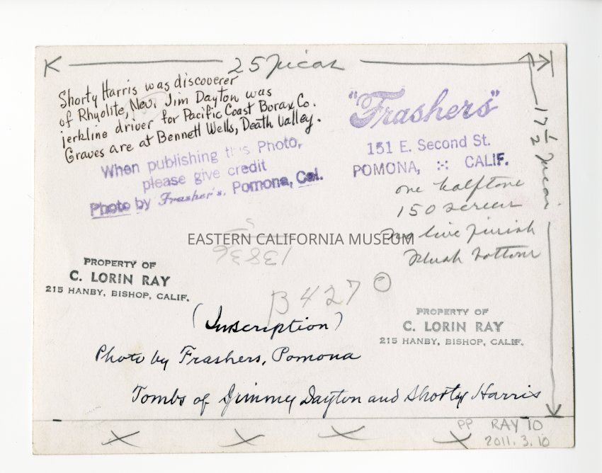Reverse: Several handwritten notes. "Shorty Harris was discoverer of Rhyolite, Nev. Jim Dayton was jerkline driver for Pacific Coast Borax Co. Graves are at Bennett Wells, Death Valley." Also, "(inscription) Photo by Frashers, Pomona. Tombs of Jimmy Datyon and Shorty Harris." B4270, 13836Photograph Details