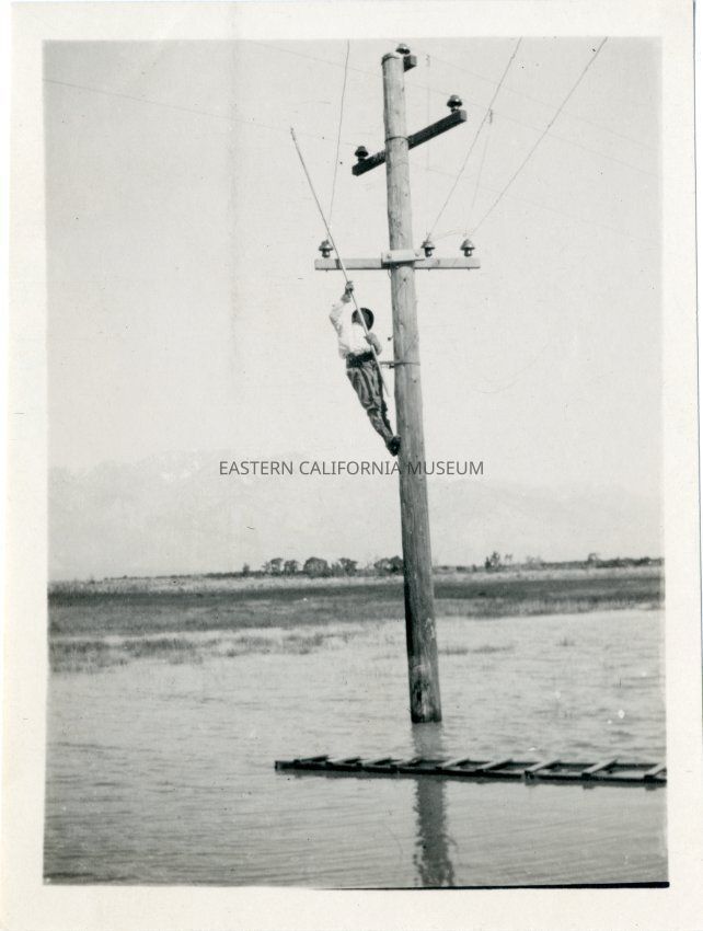 Laborer or lineman working on a power line above a flooded-out area.