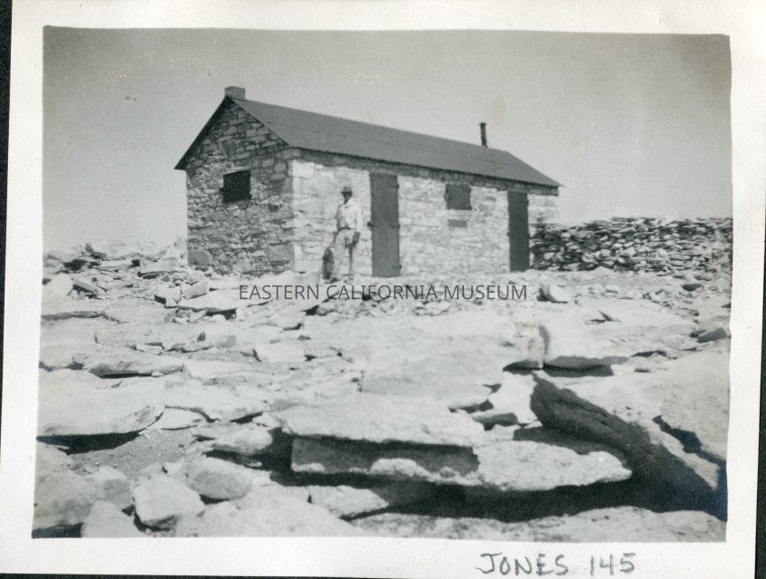 A man standing next to the Mt. Whitney summit shelter, which was originally constructed by Gustave F. Marsh, a Lone Pine resident, in 1909.Collection