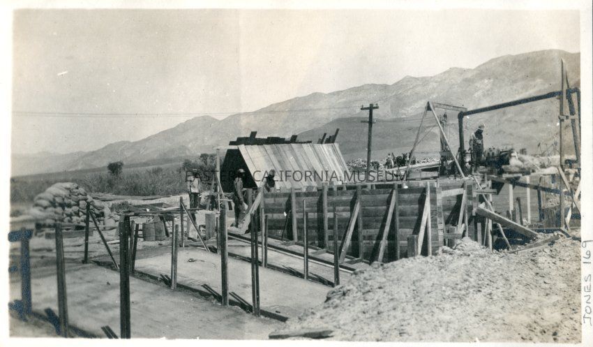 Men engaged on construction work (lining forms?) on the L.A. Aqueduct. Inyo Mountains in background.